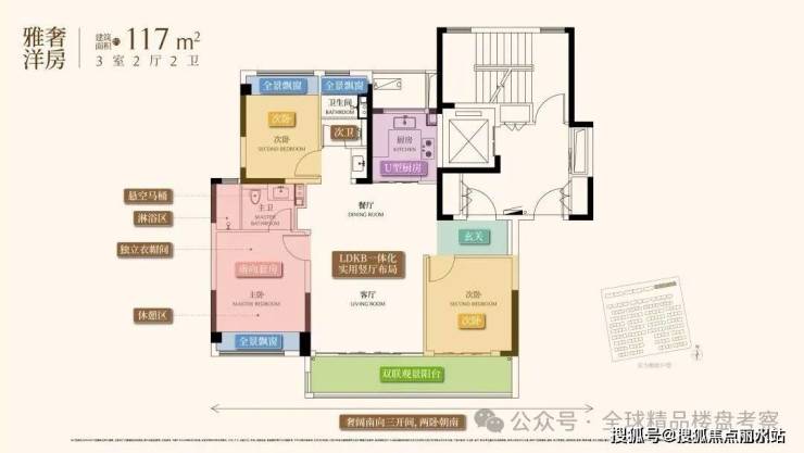 117㎡洋房:超大3房,通透双联阳台,独立玄关营造归家仪式感,经典四角户型诠释“天圆地方”的东方智慧。