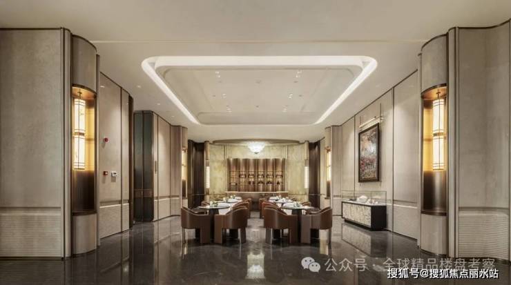 兴贤澜颂藏蕴东方礼序之韵,南入口主仪门,以宽约49米高约7米超大界面为卷,中央叠水为魂,融新中式形制于恢弘尺度。塑造归家第一道尊崇仪仗,大门屋顶取法古建“挑高飞檐”形制,深灰金属屋面仿黛瓦沉稳,铝板复刻木构肌理,斗拱暗纹隐于檐下。