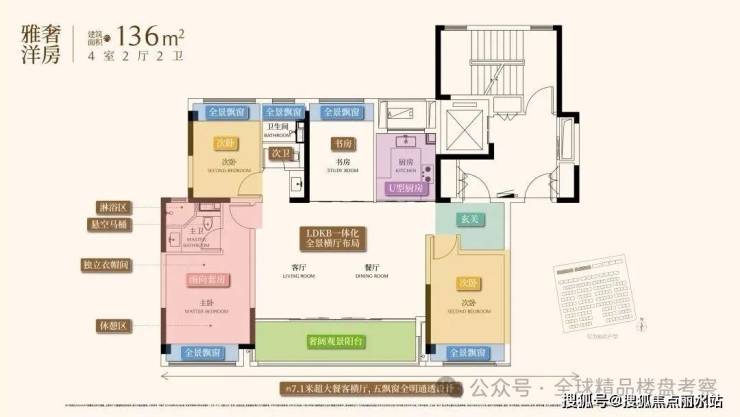 136㎡洋房:【超大横厅,奢阔4房,约7.1米超大餐客横厅,搭配五飘窗设计,引光纳景,营造全明通透的室内享受。