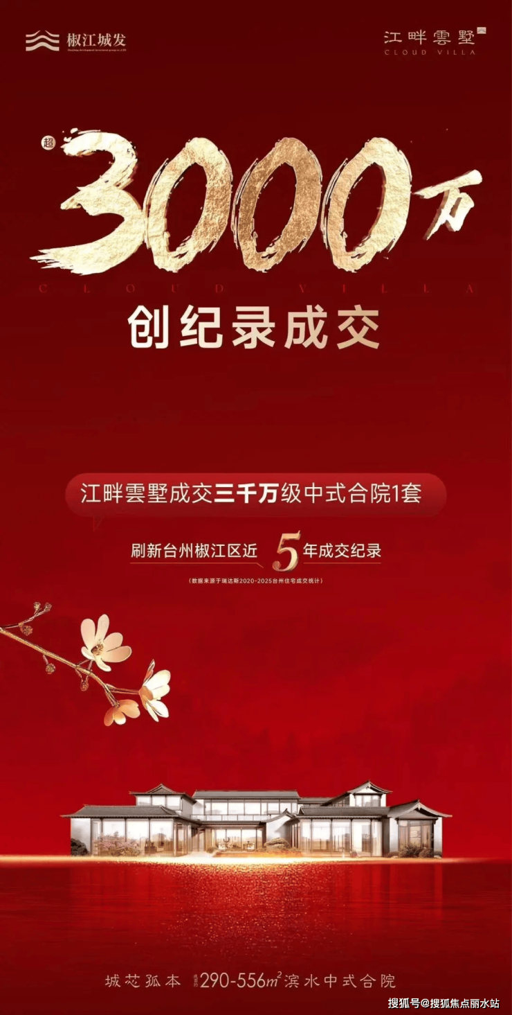 近日,台州椒江高端住宅市场迎来里程碑事件——椒江城发集团旗下永诚置业公司开发的江畔云墅,以一套超3000万级中式合院成交刷新了区域近5年豪宅成交纪录。