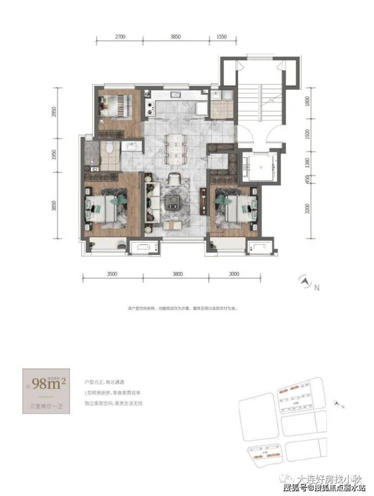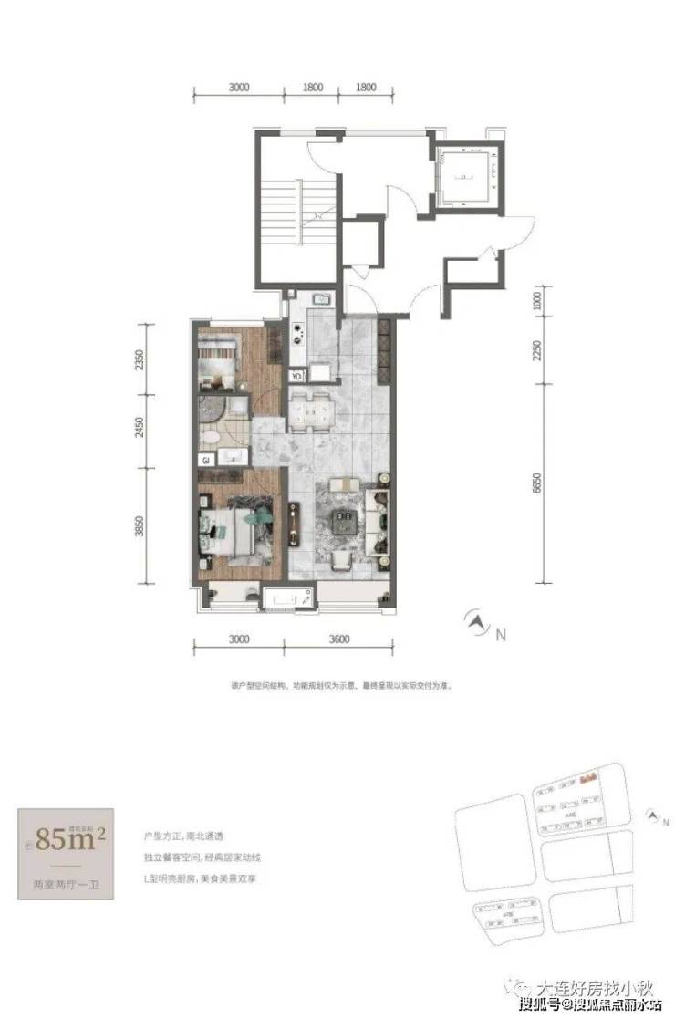 高层34层顶,85平(70%得房率)