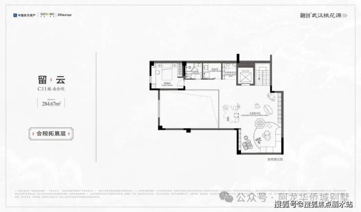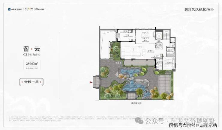 ◆主推产品◇留云|C11南合院|建面约284.67㎡· 举步即赏天心湖景,闲庭信步水杉林· 一墙之隔清漪叠瀑,置身一园江南山水· 独门独院,私家庭院面积约239㎡· 一层一代一世界,家族生活从容有度