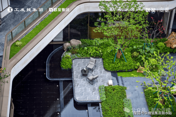 下沉式庭院包含了叠水巷道、镜面水景、名贵大树等,景观层次丰富且互动性极强。