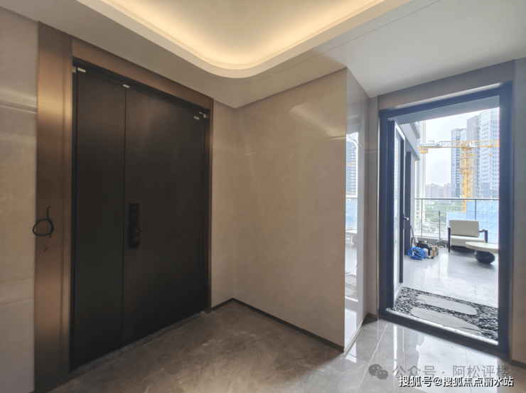 走出电梯间,除了进入客厅的大门之外,还有一个通向露台花园及主卧的入口。