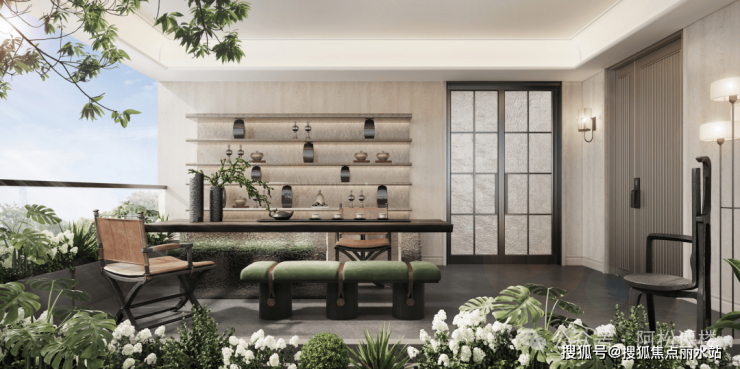 沿着景观步道前行,两侧是高低起伏的丰富花草植被,尽头是乌桕为引、配以奢石吧台、金属格栅与休闲场所的景观会客厅,在这里可以俯瞰下沉式庭院。