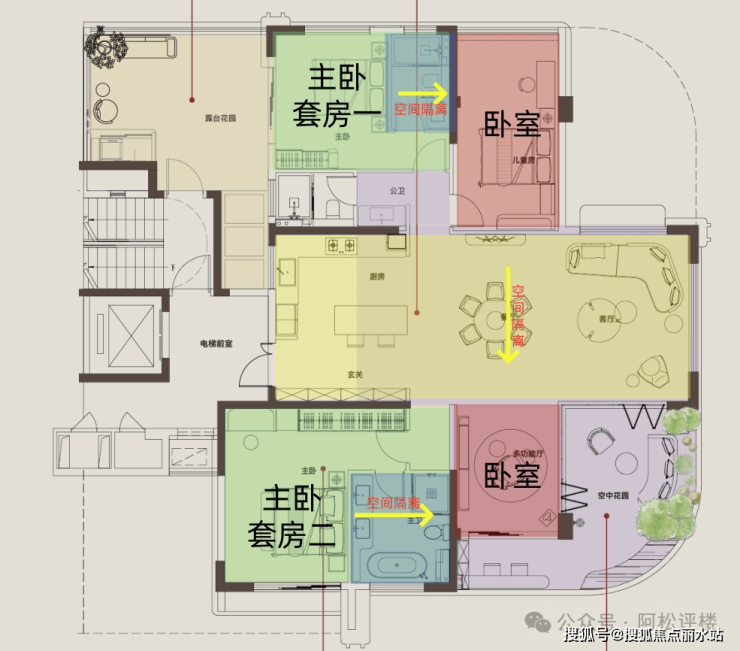 北侧双庭院、南侧大阳台和空中花园,不仅可实现双入户系统,主卧更是做到了真正的南庭北院,相当夸张。