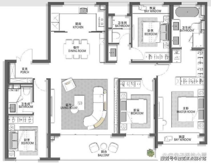 建面约228㎡洋房做到双套房、绅士&女王双衣帽间、双玄关、主卧双开门、中西双厨五双户型,且双套房布局做到全明三卫;