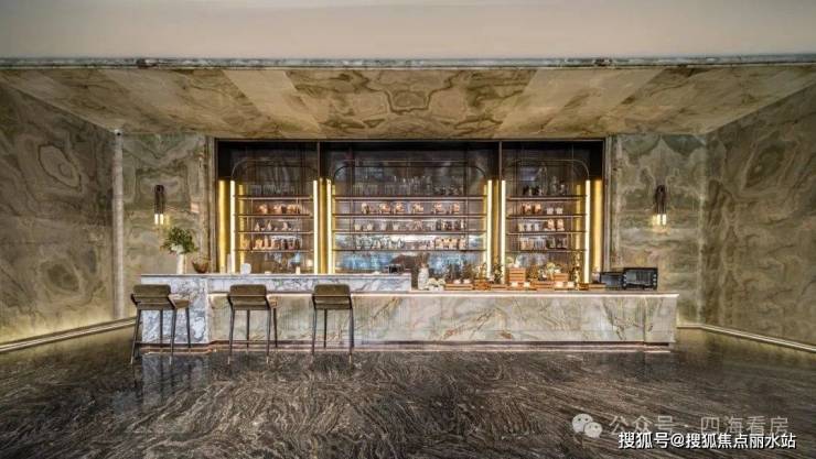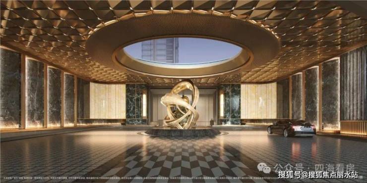🔹项目打造东、南、西三个社区入口界面,东侧利用沿街景墙连同80m+的山水归家超级界面,入口大面积金属吊顶采取“万字曲水纹”图案,体验城市收藏级归家入口。西侧约60米社区大门为业主归家车行主入口,一线对望湖滨,以伴水归家水境营造奢华游园之旅。南侧大门为别墅洋房区人行入口,取意苏州园林借景手法,营造中轴主景观节点,出入可直接眺望南湖。
