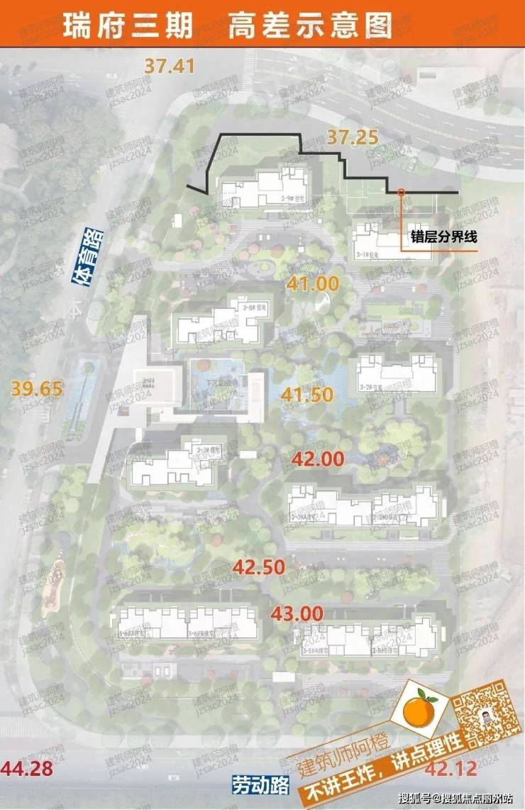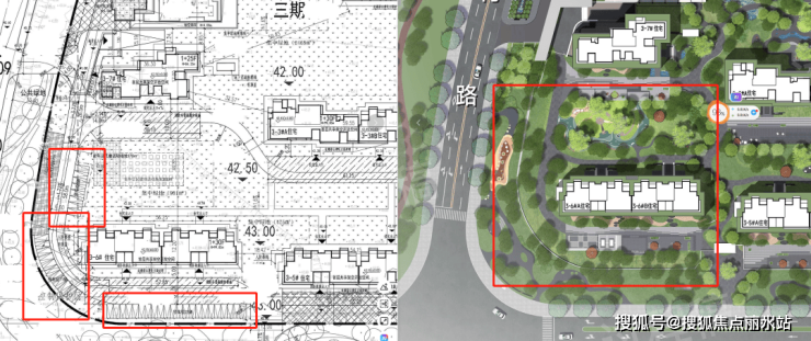 可以看到,瑞府三期也没有刻意去做抬高,而是随着道路高度的慢慢下降,将几乎所有配套都集中于北侧布置。