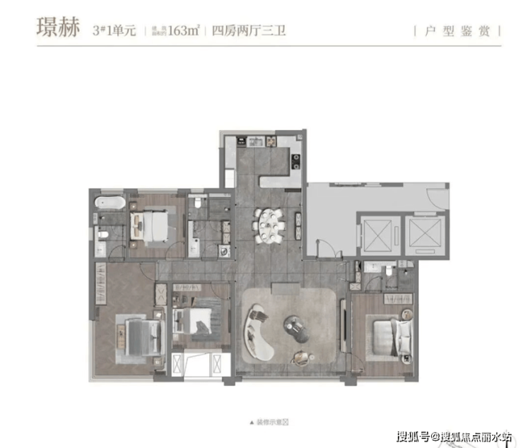 3号楼一共30层,1层架空,为153和165平的大户型,与武珞路平行,北面规划为商业、商务以及公园绿地用地,不会收到遮挡,北面楼下为露天泳池,南面会小区中心园林及会所,153平两户结构一样,都是四叶草型四房三卫双套房设计,功能性做的非常足,东边户可能合同面积略小于中建衔接胡,且在主卧设计上有一个270°观景窗,预计单价会更高一点,如果没更高,这个户型首选东边户。165平也户型,西边户有270°观景窗,合同建面偏小,选房逻辑一样的。