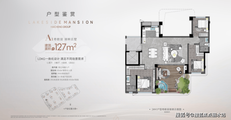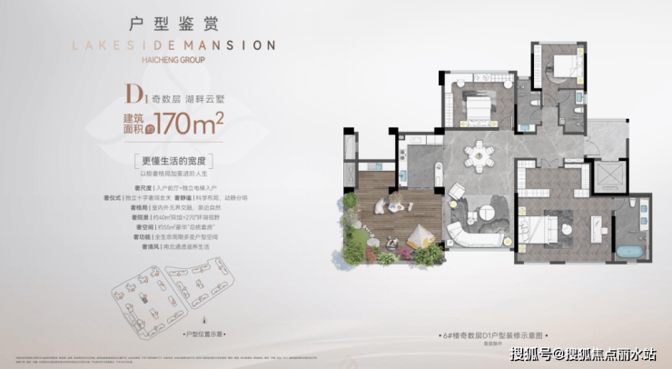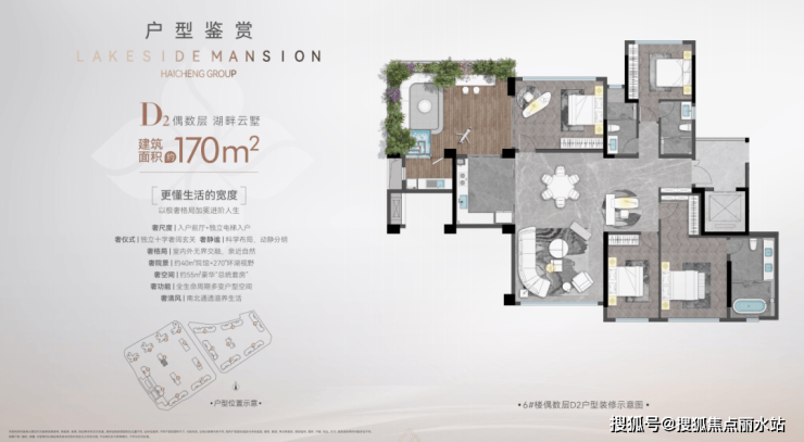 以建筑面积约170平方米奇数层湖畔云墅户型为例,约8平方米奢侈储物间、独立电梯入户、约40平方米空中私密院馆、270°环湖视野、约55平方米豪华“总统套房”……不管是横向的平面尺度,还是竖向的立体空间气场,都实现了极大突破。