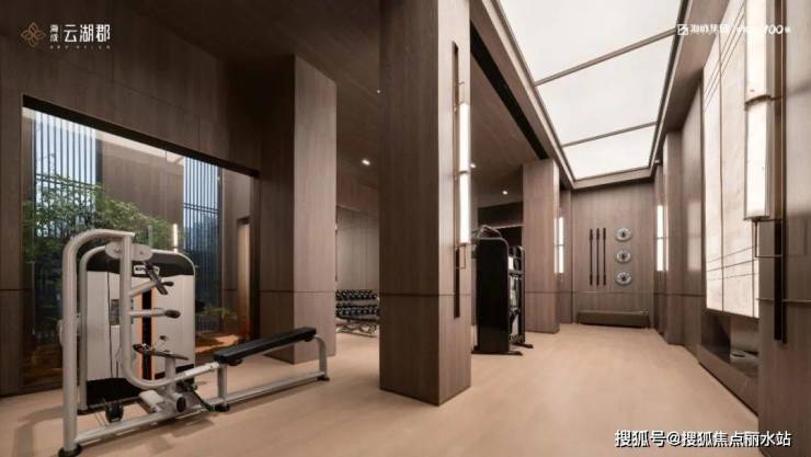 入户大堂走的奢牌酒店风,由岩板、木饰面、灯光氛围和高挑的空间构建摩登精炼。住区一共四个架空层,实景呈现的2号楼占据其中一个:带中央空调的超大、超配健身房。
