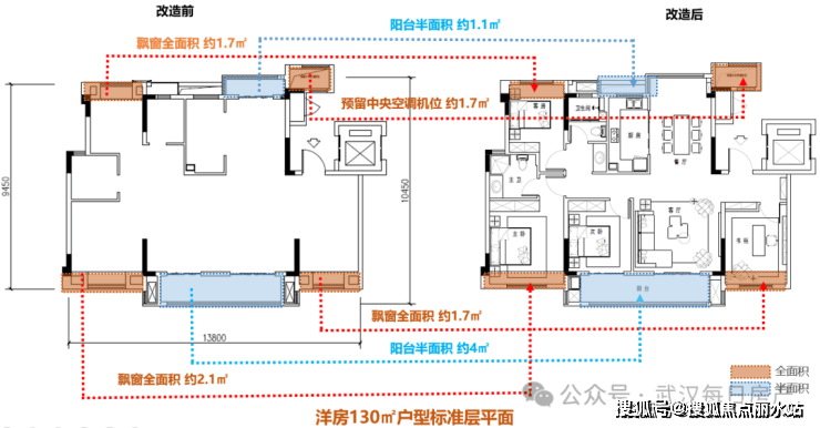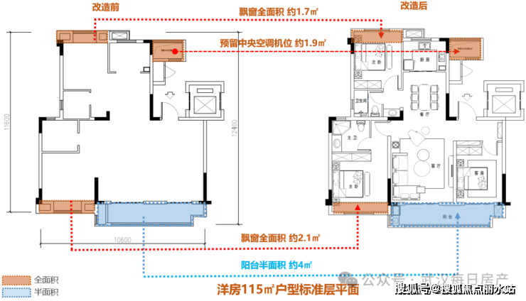④可拓展飘窗约5.5㎡、预留中央空调机位约1.7㎡及阳台约9㎡;