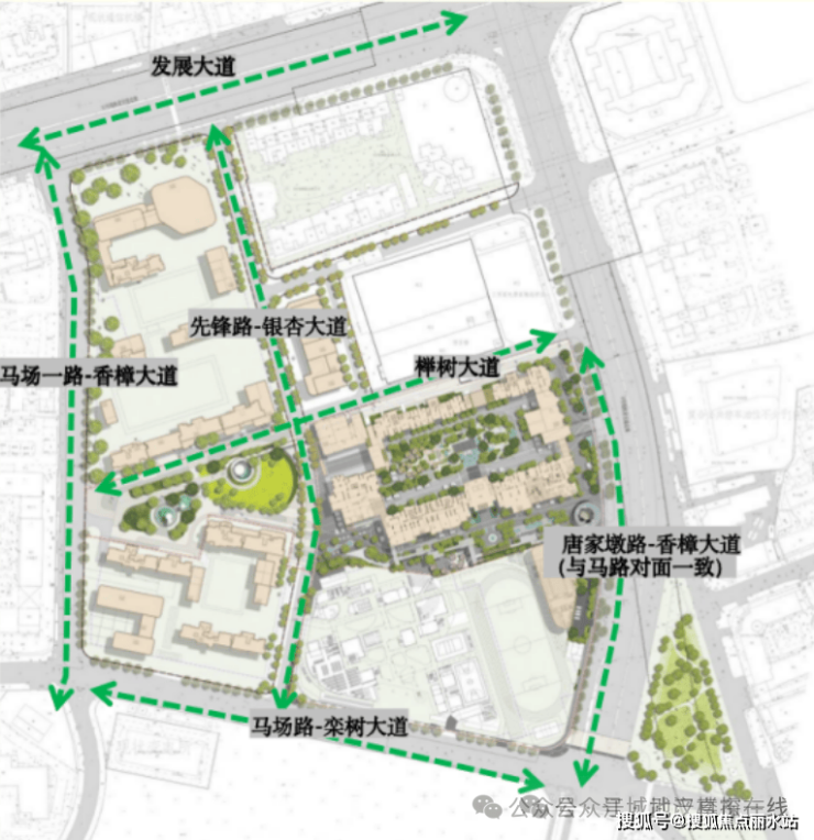 从项目的业态分布示意图可以很明确的看到,小区内规划了非常完善的城市场景,包含绿谷街区、未来市集、全龄运动、智享校园、未来邻里、健康社区、韧性公园、花园办公、智慧交通等。大部分城市服务都能在小区内得到满足。
