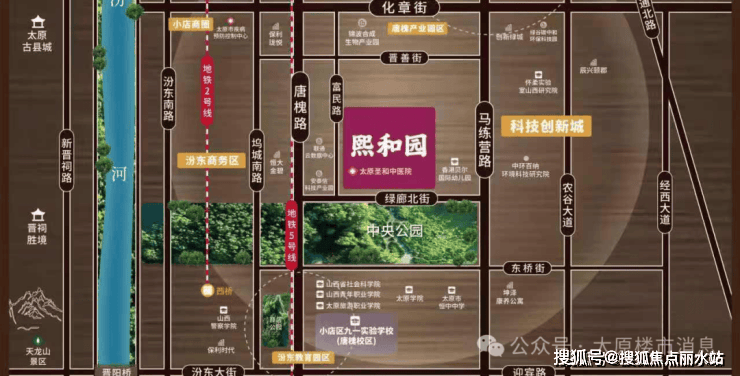 熙和园项目位于综改区核芯——唐槐产业园区,大太原十字核心,北至晋善街、南至绿廊北街,西起富民路、东至马练营快速路,与东边的科技创新城仅一步之遥,西接汾东商务区,南邻汾东中央生态景观绿廊。