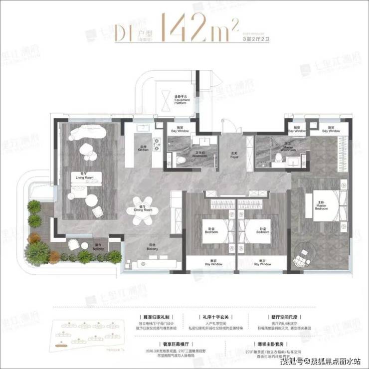 1 河景视野的集大成者。观河、赏园,这是区别于传统项目的特质。项目南向直面七里河,无任何遮挡,是当下南京罕见的一线临河新房。