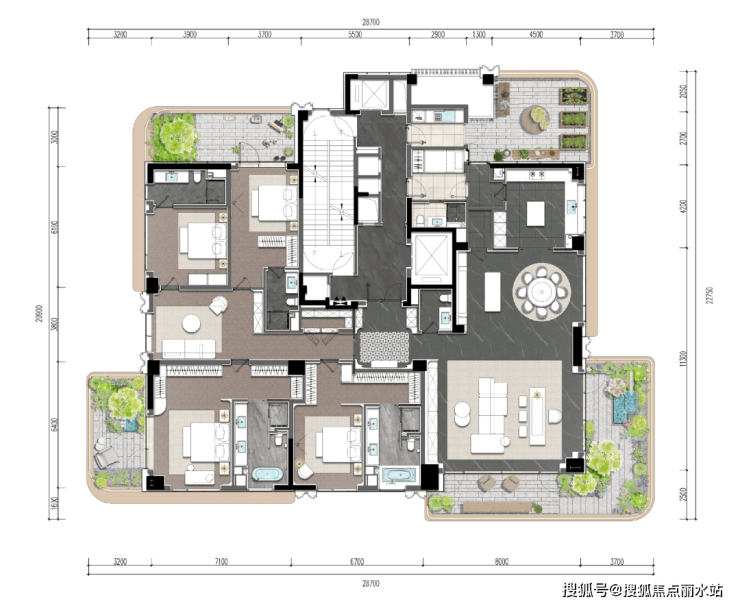 最颠覆性的是,作为有着五年六座空中庭院经验的江山万里,在半岛的空中庭院打造上,完全突破了四代宅仅仅南北向的露台设计,创造出了“全环景空中庭院”!
