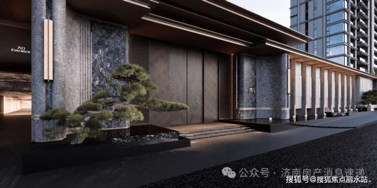 九宸·云台擎荷,整体门头柱子如荷叶托举的云台之境。明月松间照,清泉石上流;三级台阶、步步高升