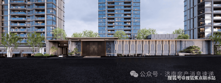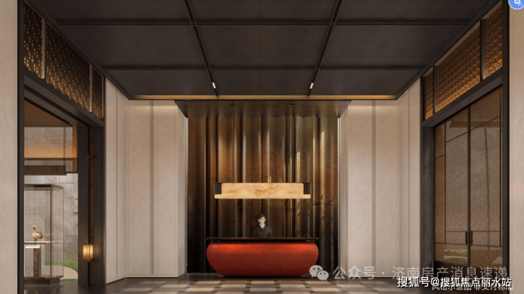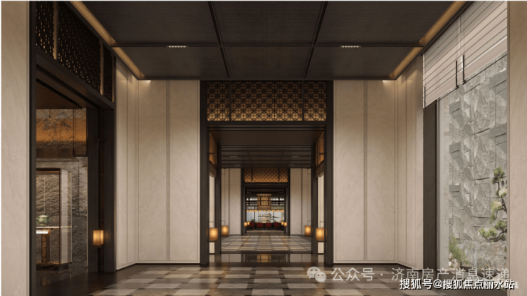 约77m南大门(不含围墙)+约9m高门厅+9根云柱如荷托举;奢贵液态金属,名贵奢石辉映,尊贵王府气质,齐鲁豪门之首
