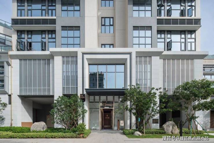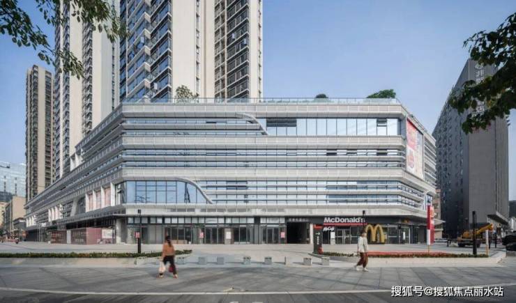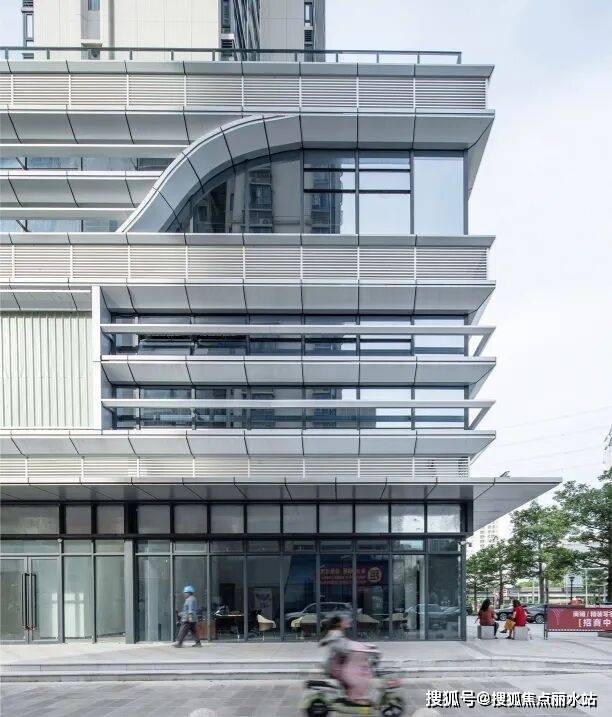 建筑采用了公建化立面的设计,有别于常见住宅裙楼底商分段式的设计,商业裙楼立面采用整体化设计,通过横线线条和优雅的弧线交织形成灵动柔美的商业裙楼立面,展现城市转角处自由流动的标志性形象,引领虎门年轻与时尚新风尚。
