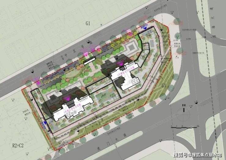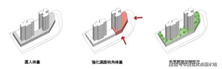 以点布局,商业群楼和住宅区出入口及内部花园分别朝向不同的道路,满足商业和住宅的使用人流相互分离,繁华的城市氛围与舒适精密的归家气氛互不干扰。
