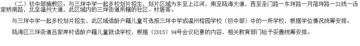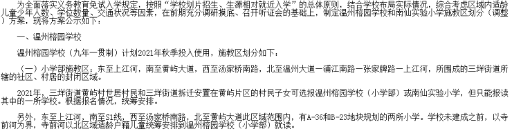 施教区范围:东至上江河、南至瓯海大道、西至汤家桥南路、北至S1线,围成的三垟街道所辖的社区、村居的封闭区域。