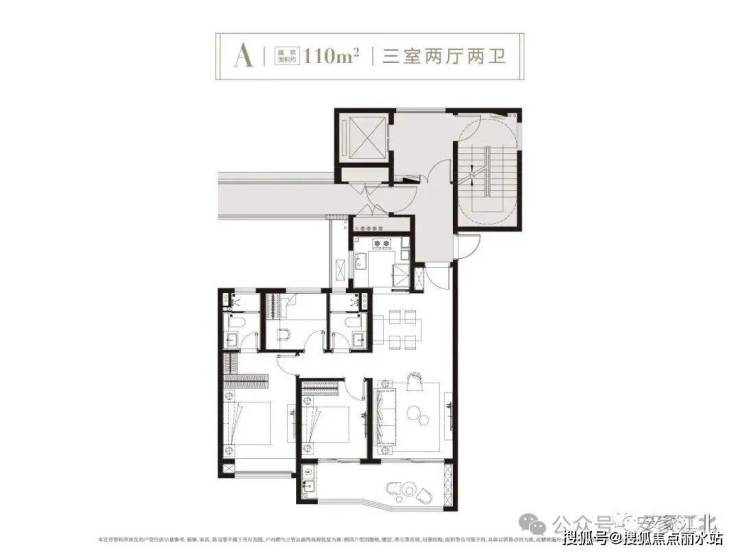 建面约110㎡户型为三房两厅两卫设计,三开间朝南,双阳台设计,主卧套房约20㎡,相当于130㎡主卧套房配置,更赠送步入式衣帽间。