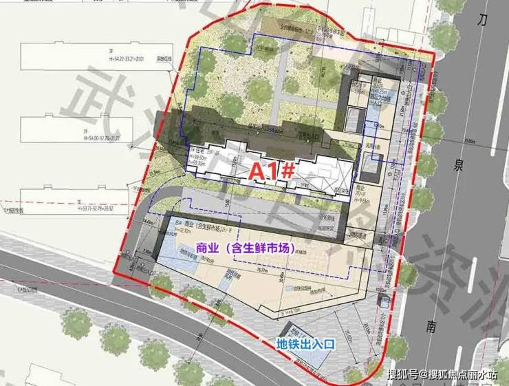 A地块还带有一个2000㎡生鲜市场,在地块的东南角还有一个地铁出入口。