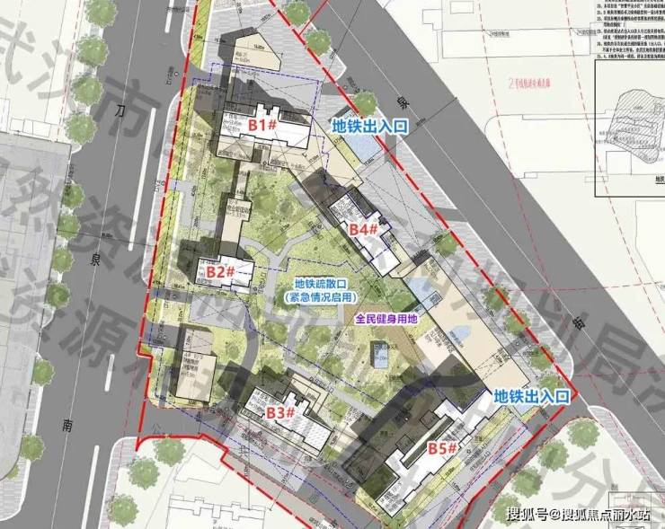 B地块有3个地铁出入口,真正的地铁上盖项目,其中地块内部的是地铁疏散口,平时关闭,紧急情况启用;此外在地块中间有个全民健身用地;项目的主入口位于卓刀泉南路,在B1#和B2#之间。