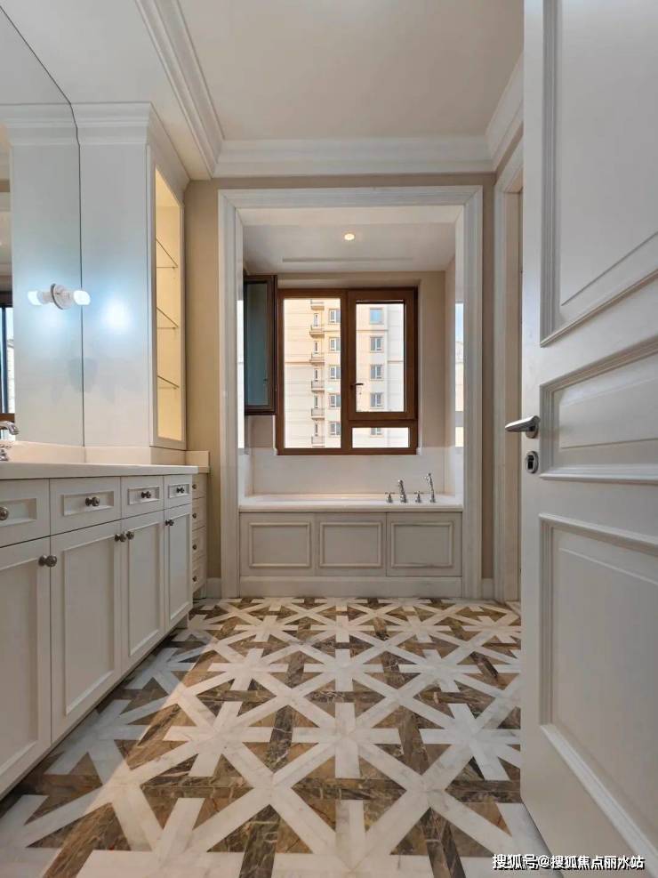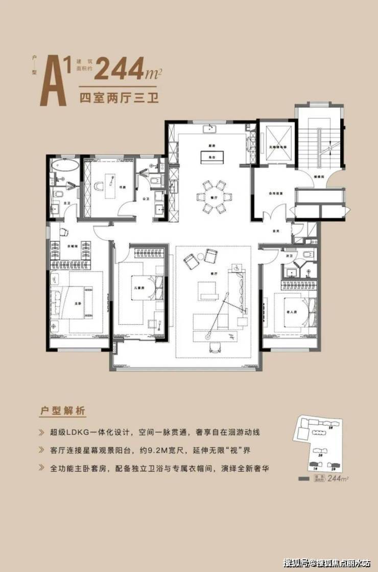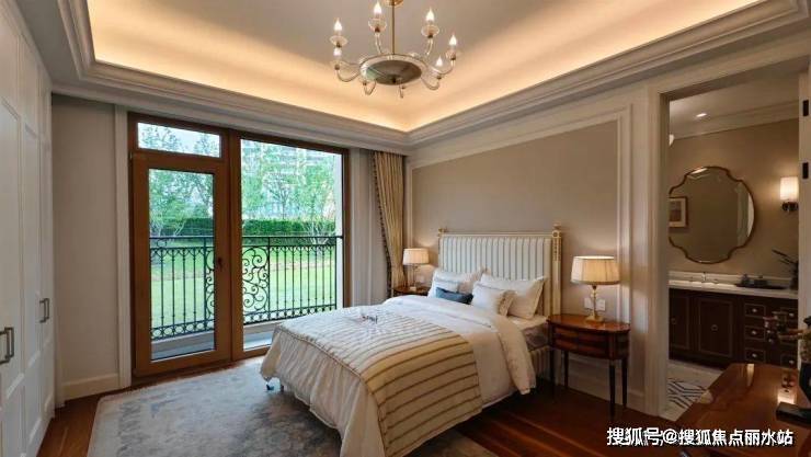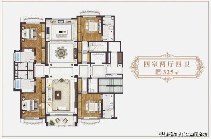 建面325平户型采用十字对称的四叶草格局,每间卧室「平权化」呈现。而且,每间卧室均具备观景阳台、衣帽间、休息区和卫浴空间。