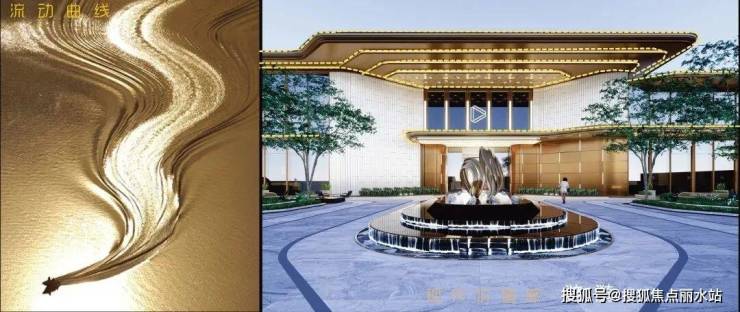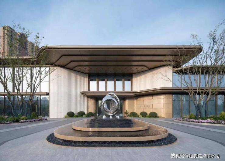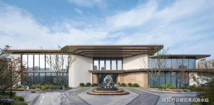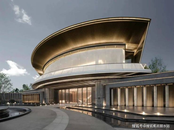 设计团队根据区域背景进行设计,提取建筑形态和符号,项目示范区售楼处建筑采用对称的形体构图,一层灰色石材、古铜色铝板及金属线条的使用,营造出酒店般奢华尊贵感受;二层弧面玻璃、浅色铝板又形成轻盈时尚的气质。