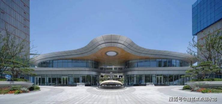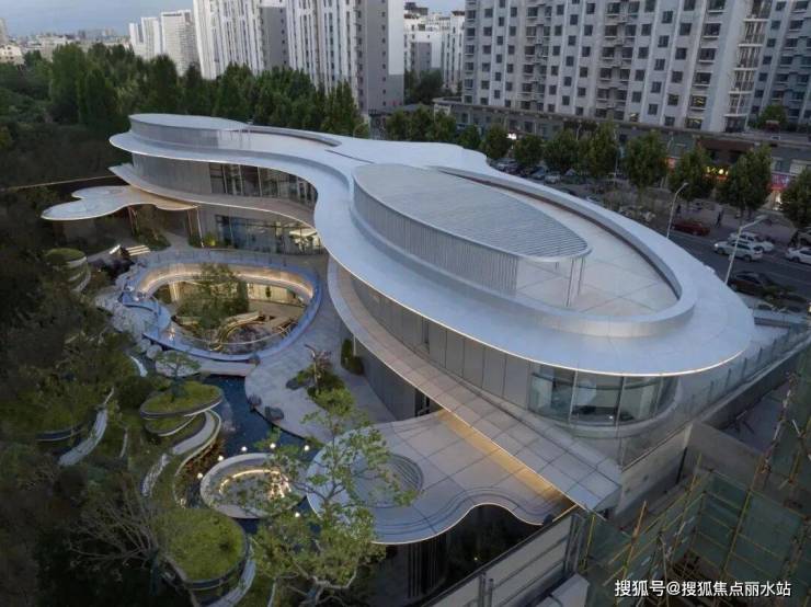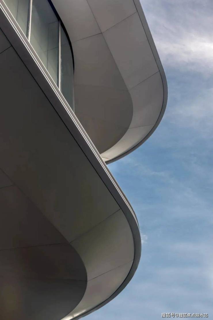 整体来看,圆角结合层层上升的屋檐,如水波涟漪,通过圆弧的建筑语言以及材料的层叠组合,体现了建筑的自由、流动和韵律,形成了建筑独特的标识性。