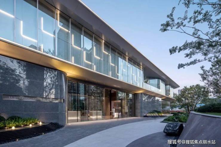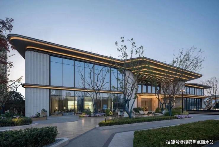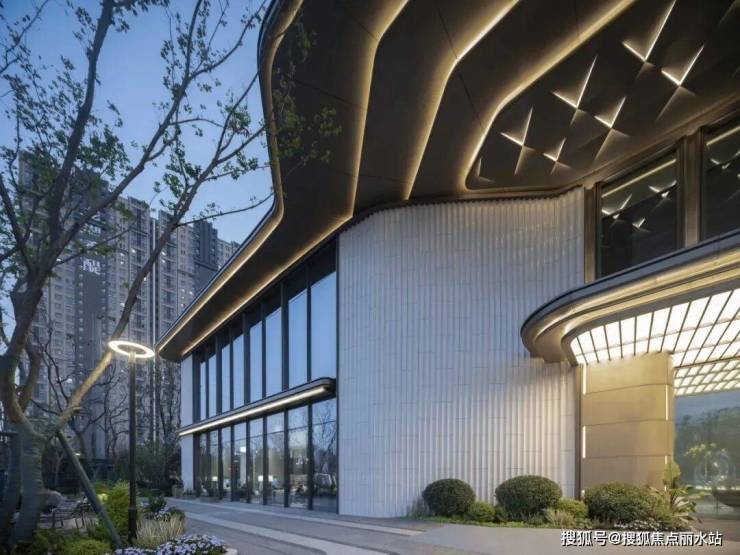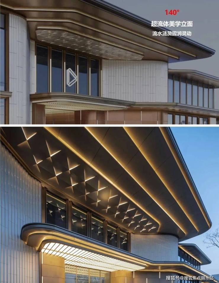 示范区建筑外立面设计采用了全铝板和玻璃幕墙体系的组合,摒弃繁杂的外立面装饰设计,采用超流体风格,建筑师在设计过程中特别关注立面比例控制和曲线形体造型的精致呈现,每个细节都经过精心计算和布局,确保整体的协调和谐,使建筑外观更加流畅优雅,营造精致秩序感和简洁高雅气质。