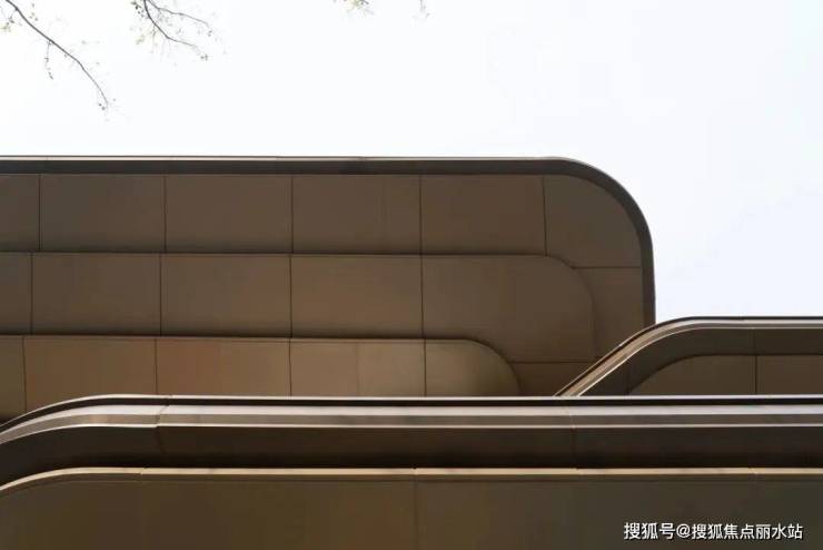 立面建筑材料选择金色铝板搭配米白色陶板,一浅一深,采用倒圆角与横线线条的设计手法,圆角曲线与横向线条巧妙的产生了对话,增添建筑的艺术气息。