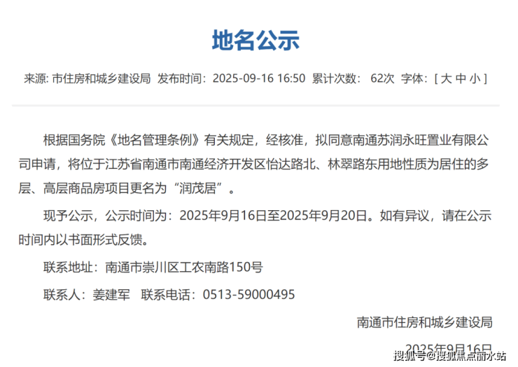 日前,南通市住房和城乡建设局发布地名公示:根据国务院《地名管理条例》有关规定,经核准,拟同意南通苏润永旺置业有限公司申请,将位于江苏省南通市南通经济开发区怡达路北、林翠路东用地性质为居住的多层、高层商品房项目更名为“润茂居”。