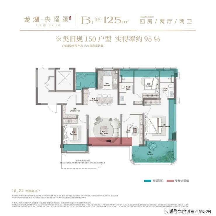 这是什么概念呢?按照市面上常规洋房产品,得房率80%来计算,一套130㎡的房子,实得面积约104㎡。而按照龙湖北城央璟颂约110%实得率来计算,实际能得到143㎡的空间,同样的价格,直接多拿40㎡(一个客餐厅的空间)。