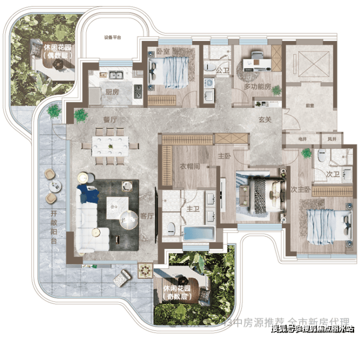 115-190㎡一线河景观邸,6.2米挑高花园阳台,270°立体环绕庭院,让山河回归府邸,让生活回归自然。空间采用创新的LDKB-Y五维一体设计即客、餐、厨、阳台、庭院融为一体,打造超尺度家庭社交场域,形成无界交流和会客空间,敬献立体花园住宅灯塔级作品。