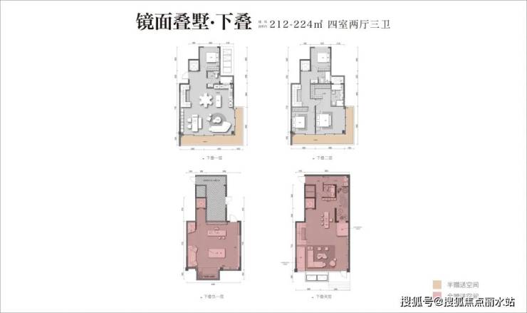 建面约212-224㎡的镜面下叠,地上3层,实际可使用率约187%。