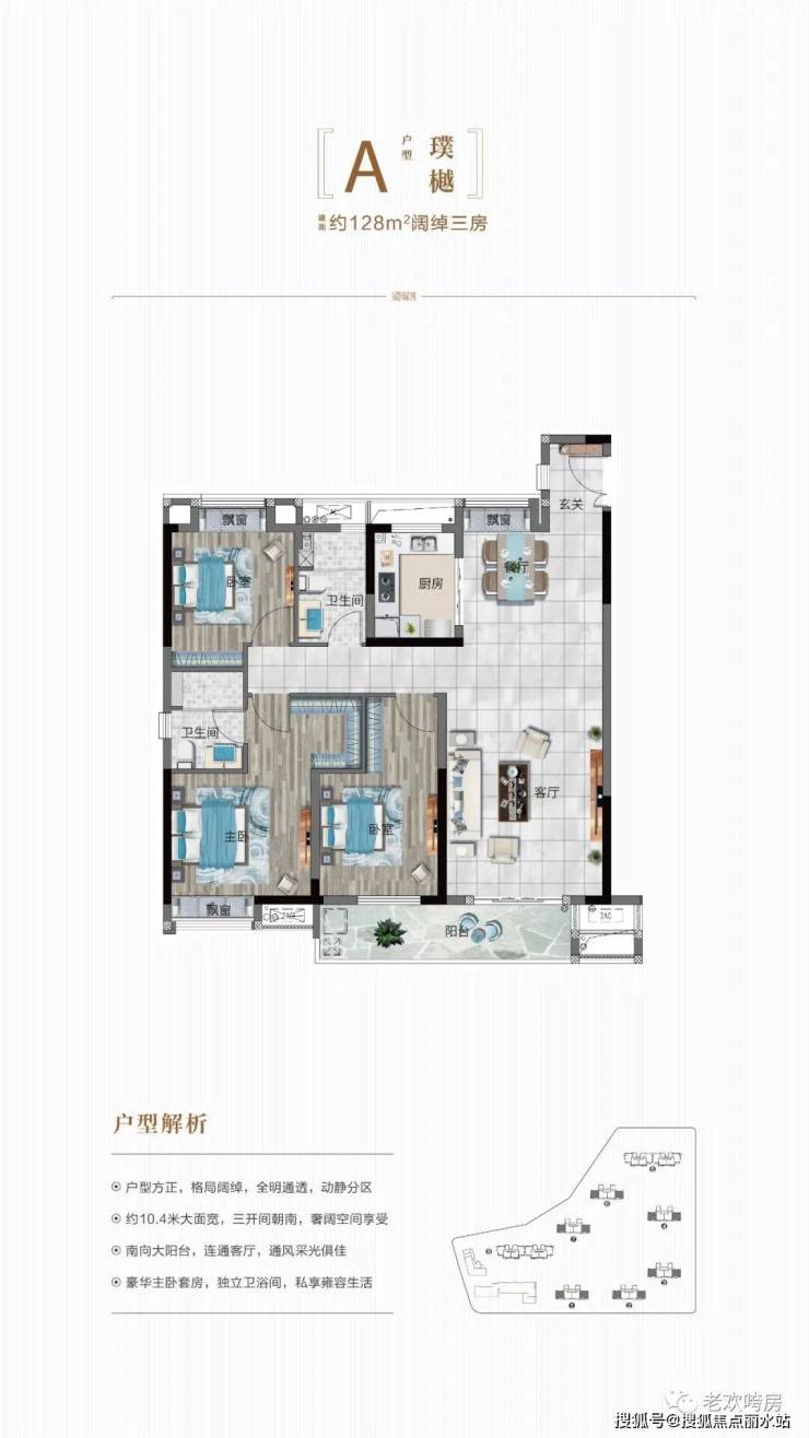 以建面约128平边户为例,不仅三开间朝南,而且南向面宽达到约10.4米。