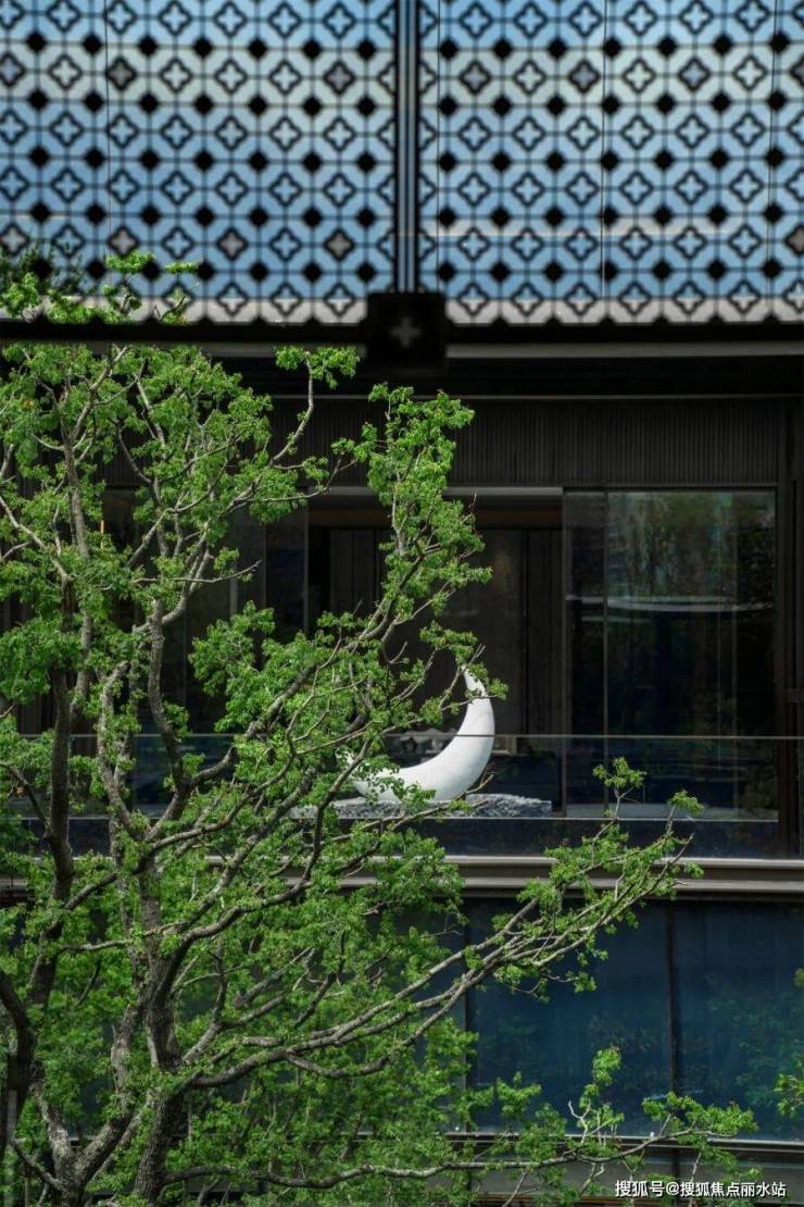 迎宾入口师法江南大宅,选用整面“蓝翡翠奢石”打造了照壁,约 80m超大尺度的景墙,宝石般的中心水景,给予人们酒店落客式的尊享归家体验。