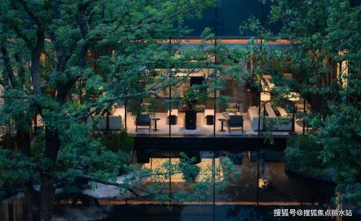 景观放大了树和水的元素,主要选用树王级稀贵树种,大面积的下沉式镜面水庭,中间缀以石材形成岛屿般的汀步、蜿蜒的岸线、碧波枕弦月,弧形的运用让艺术美感在园林里自由穿梭,也辗转出不同的场景韵味。
