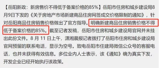 时间梳理8月13日,湖南岳阳出台今年排名前列限跌令,商品住房销售的实际成交价格不得低于备案价格的85%,言外之意就是房价下跌不能超过15%。