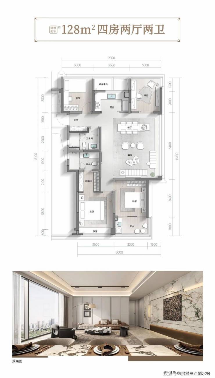 空间效能进化 超90%得房率在空间效能维度,君潮润府通过面宽的增加,将主客厅面宽拓展至7.8米,配合封闭式景观阳台设计,使225㎡户型在得房率超90%的前提下实现五房五卫三套房的格局。每户的客餐厅及主卧的面宽都加大了300mm。