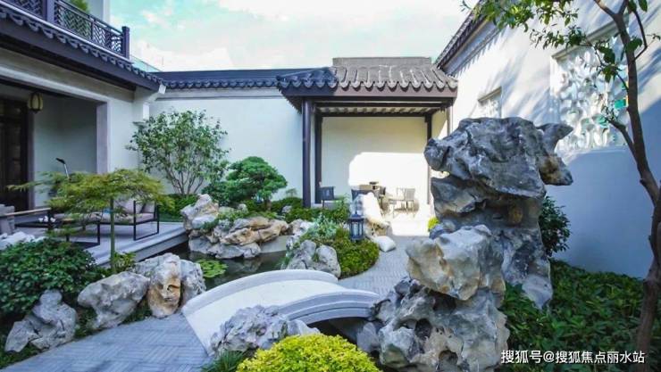 我们说,江南园林甲天下,苏州园林甲江南,比如像我们现在看到的园林布局,就是经典的苏州园林景观,讲究引水入园。造景围绕着这片水景展开,空间上比较有层次感。近景是流水、堆石,中景是连廊、假山,远景是中式合院的院墙、屋檐。