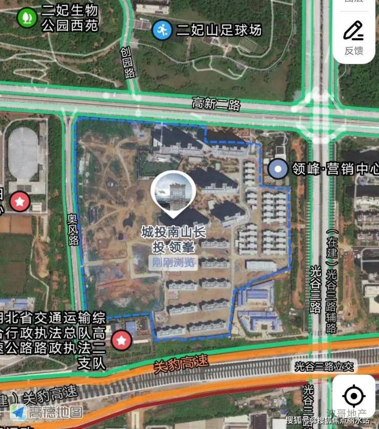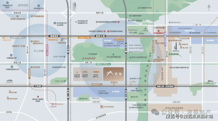 项目四至:北侧高新二路、二妃山公园等;南侧为关豹高速;西侧为奥风路、湖北省体育局田径运动管理中心等;东侧为光谷三路、碧桂园云境、恺德光谷熙园等。