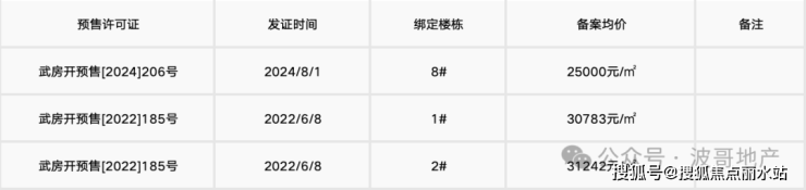 备案价:项目第一次取证为2022年6月8日,1、2号楼精装备案均价约在31000元/㎡;8号楼在2024年8月1日取证,毛坯备案均价25000元/㎡。