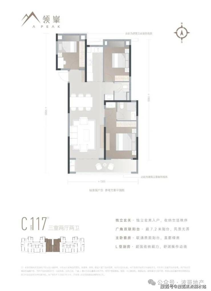 C户型117㎡三房两厅两卫:此户型分布在1号楼,2梯四户布局,2个单元的夹边户;入户带独立玄关、仅2开间朝南,户型比较狭长,相对客餐厅采光较差,通透性一般;南向阳台宽约7.2米。