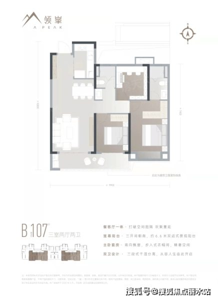 B户型107㎡三房两厅两卫:此户型分布在1号楼,2梯四户布局中间户型,北面连廊连接接;常见三开间朝南、动静分区设计,南向阳台宽约6.6米。