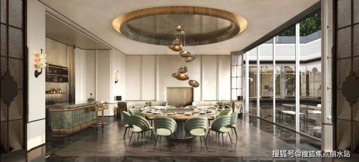 宽大的仿铜鎏金铝板挑檐下,贝金米黄石材搭配亚马逊绿奢石的景墙,做出层层递进的弧形叠级。