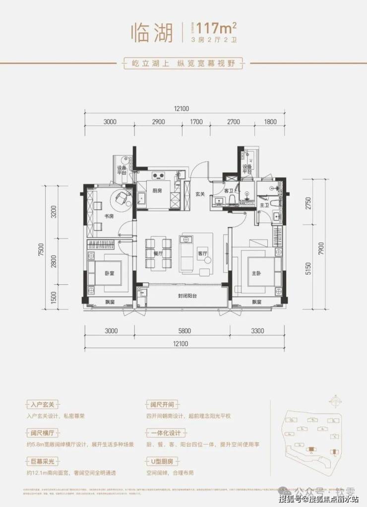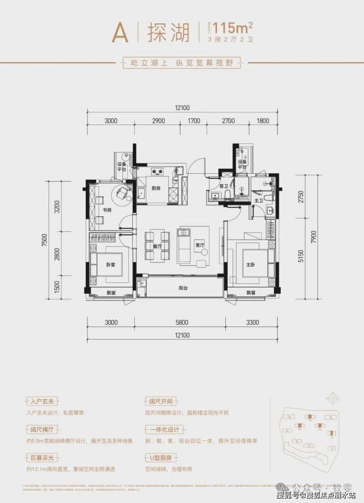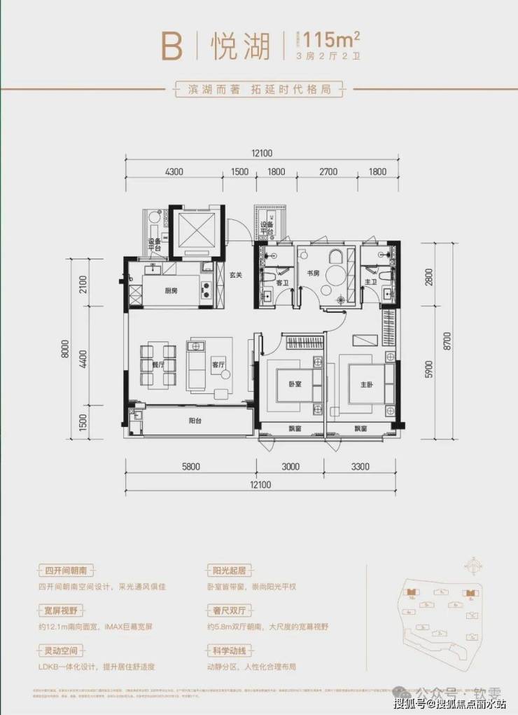 115㎡B三室两厅两卫:项目起步户型,主要分布于10#14#中间套,南向三开间面宽超12米,两房朝南,主卧套房设计,南向阳台面宽5.8米;
